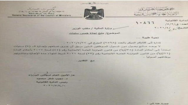 وذكرت وثيقة عن الامانة اطلعت عليها وظائف العراق أنه " لا يوجود مانع بتمتع الموظفين الذي سبق وأن تمتعوا بإجازة الأربع سنوات باجازة الخمس سنوات التي اقرتها المادة 26 من قانون الموازنة لعام 2021 شرط انتهاء مدة اجازتهم ومباشرتهم بوظائفهم اصوليا".