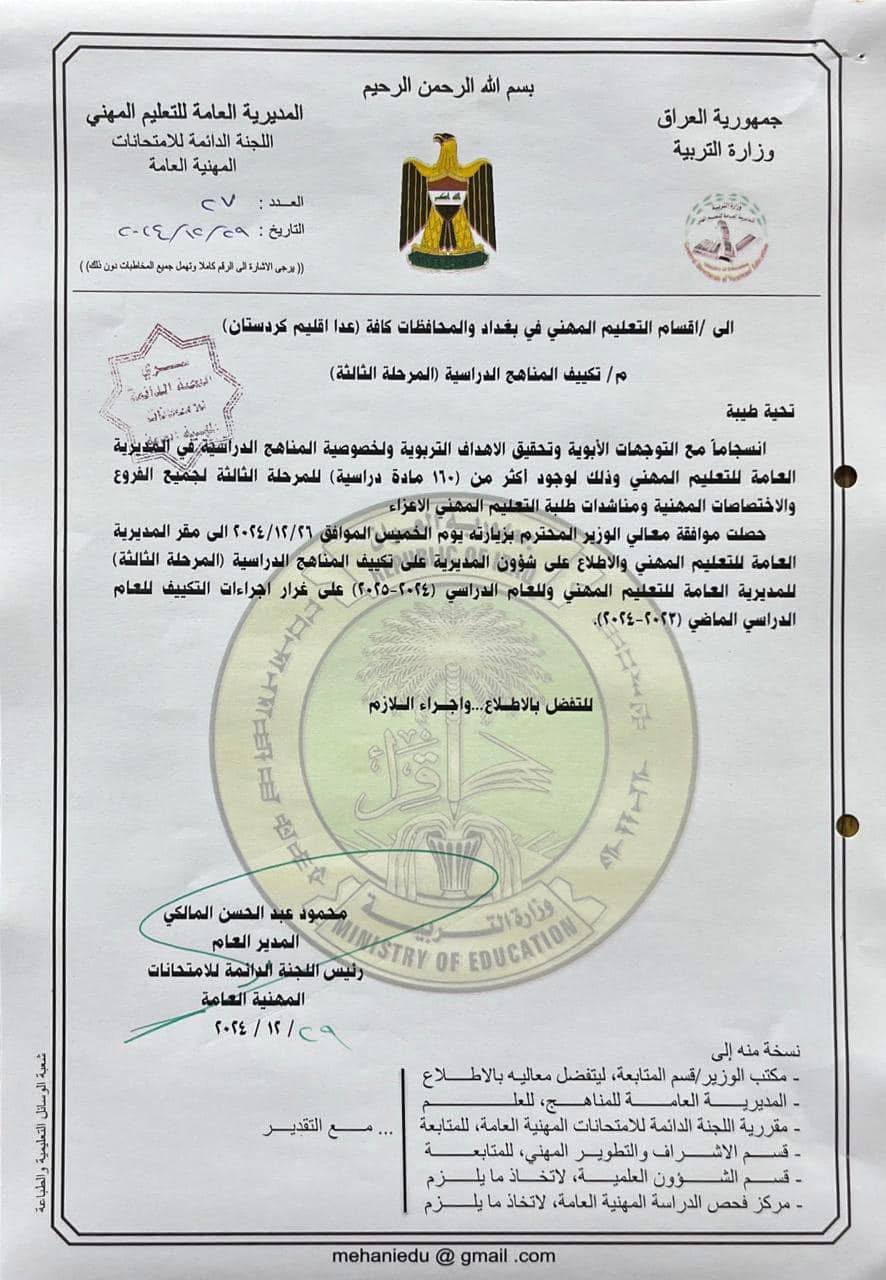 وافق وزير التربية ابراهيم نامس الجبوري، على تكييف (تقليص) المناهج الدراسية (المرحلة الثالثة) للتعليم المهني.