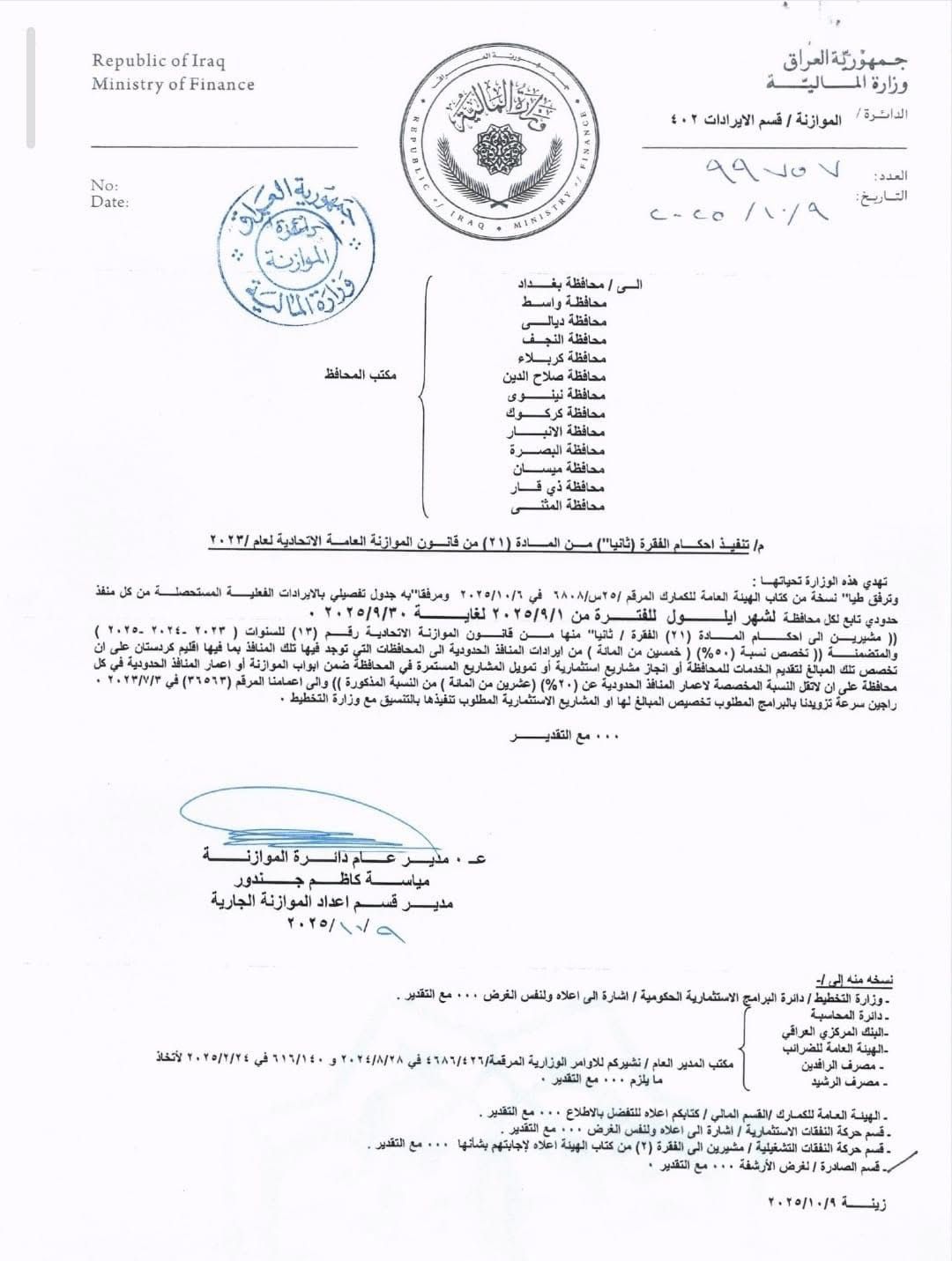 وأكدت، أن "كتابها الرسمي الصادر عن دائرة الموازنة المرقم 99757 في 9 تشرين الأول 2025 والذي يدعو فيه المحافظات المعنية الى سرعة تزويد دائرة الموازنة بالبيانات المطلوبة، بيّن بوضوح الإيرادات المتحققة من كل منفذ خلال شهر أيلول 2025، ونص على تخصيص 50 بالمائة من تلك الإيرادات لدعم المشاريع الاستثمارية والخدمية في المحافظات، استناداً إلى أحكام المادة (21) من قانون الموازنة العامة رقم (13) للسنوات 2023 و2024 و2025، وهو ما يدحض الأنباء المتداولة حول إيقاف الإيرادات".