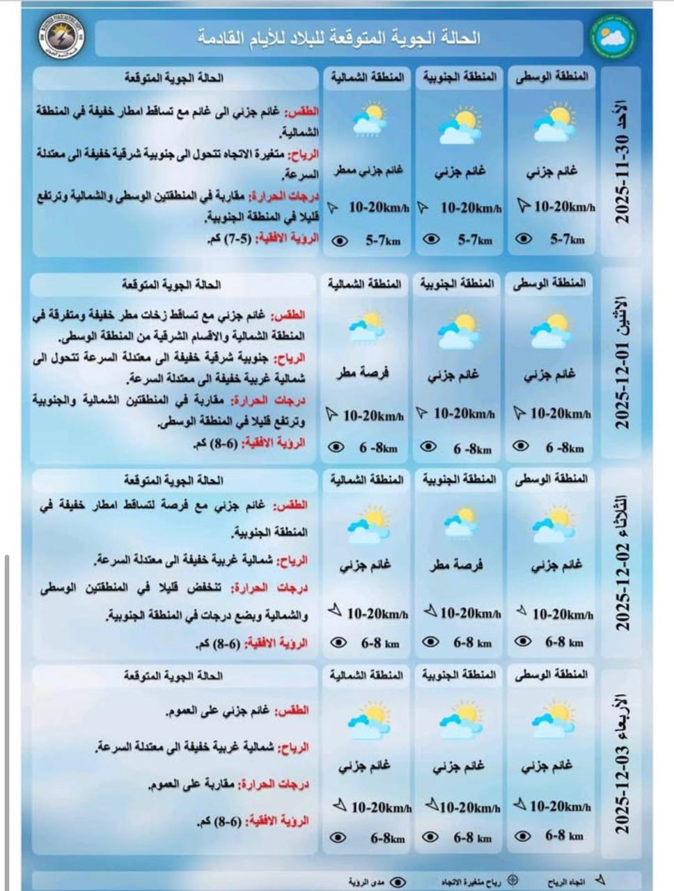 وأضافت أن "طقس بعد غد الإثنين سيكون غائماً جزئياً مع فرصة لتساقط أمطار خفيفة ومتفرقة المنطقة الشمالية والأقسام الشرقية من المنطقة الوسطى، ودرجات الحرارة مقاربة في المنطقتين الشمالية والجنوبية وترتفع قليلاً في المنطقة الوسطى"، مشيرة الى ان "طقس يوم الثلاثاء المقبل سيكون غائماً جزئياً مع فرصة لتساقط أمطار خفيفة في المنطقة الجنوبية، ودرجات الحرارة تنخفض في جميع محافظات العراق".