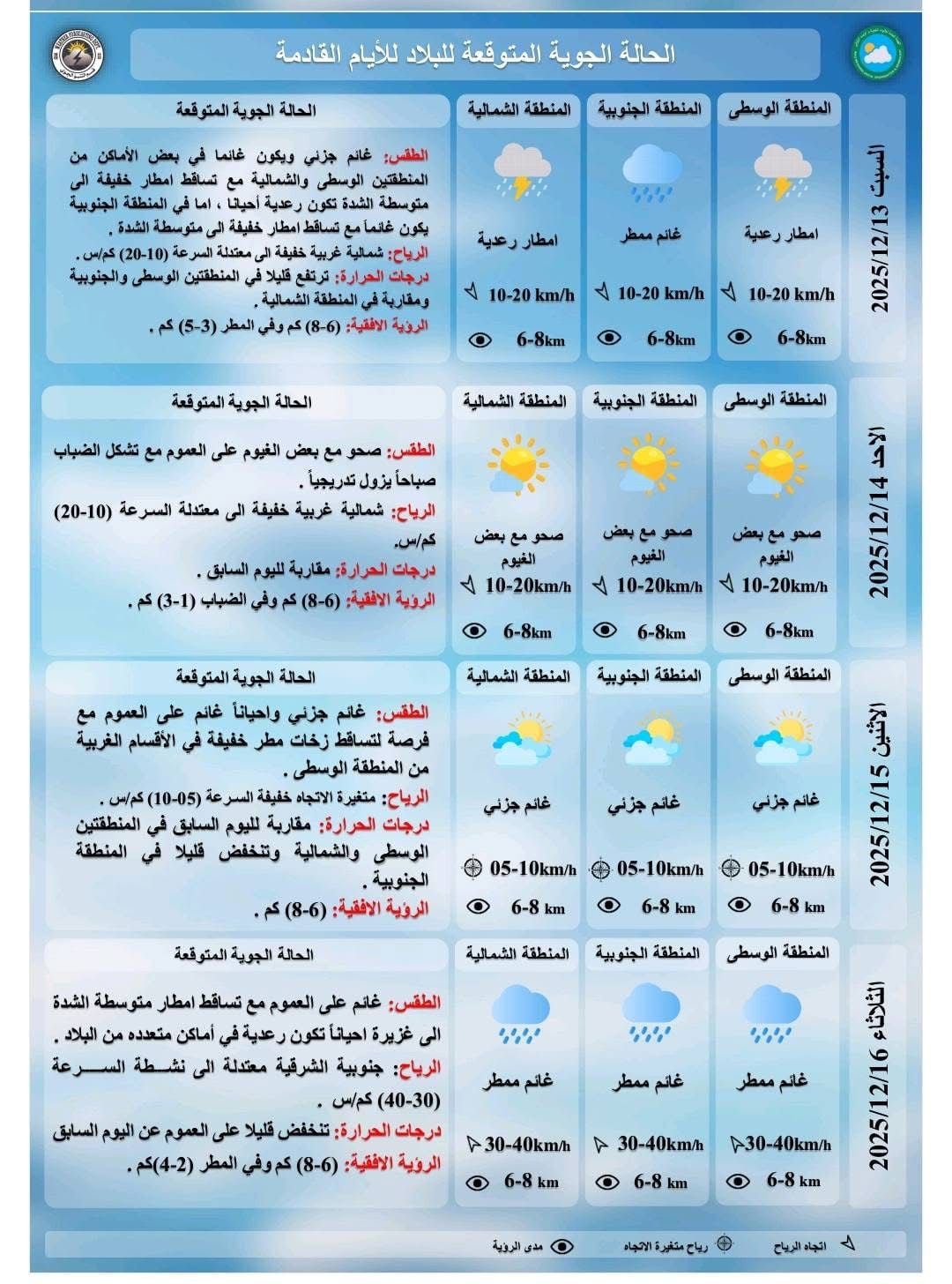 وقالت الهيئة في بيان ان "طقس يوم غد السبت سيكون غائما جزئيا في بعض أماكن المنطقتين الوسطى والشمالية مع تساقط الأمطار الخفيفة الى متوسطة الشدة تكون رعدية أحيانا اما في المنطقة الجنوبية يكون غائما مع تساقط الامطار الخفيفة المتوسطة الشدة ودرجات الحرارة ترتفع قليلا في المنطقتين الوسطى والجنوبية ومقاربة في المنطقة الشمالية"، مبينة ان "طقس يوم الأحد المقبل سيكون صحوا مع بعض الغيوم وتشكل الضباب صباحا يزول تدريجيا ودرجات الحرارة مقاربة لليوم السابق على العموم".
