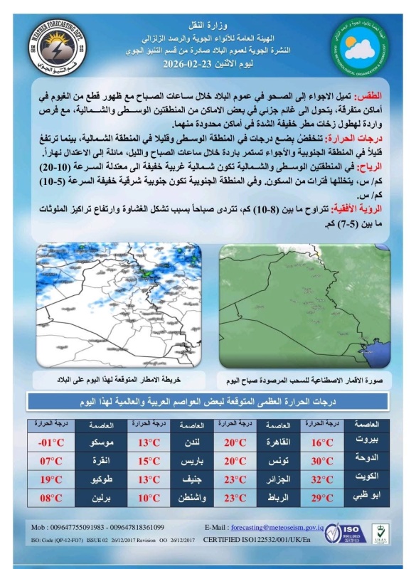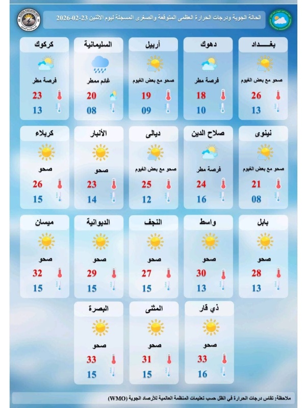 توقعت هيئة الأنواء الجوية، اليوم الاثنين ( 23 شباط 2026 )، أن تميل الأجواء إلى الصحو صباحًا في عموم البلاد مع ظهور سحب متفرقة، تتحول إلى غائم جزئي في بعض مناطق الوسط والشمال، مع فرص لهطول زخات مطر خفيفة ومحدودة، مشيرة إلى انخفاض درجات الحرارة بضع درجات في المنطقة الوسطى وقليلًا في الشمالية، مقابل ارتفاع طفيف في الجنوبية، مع استمرار الأجواء باردة صباحًا وليلاً ومعتدلة نسبيًا خلال النهار.