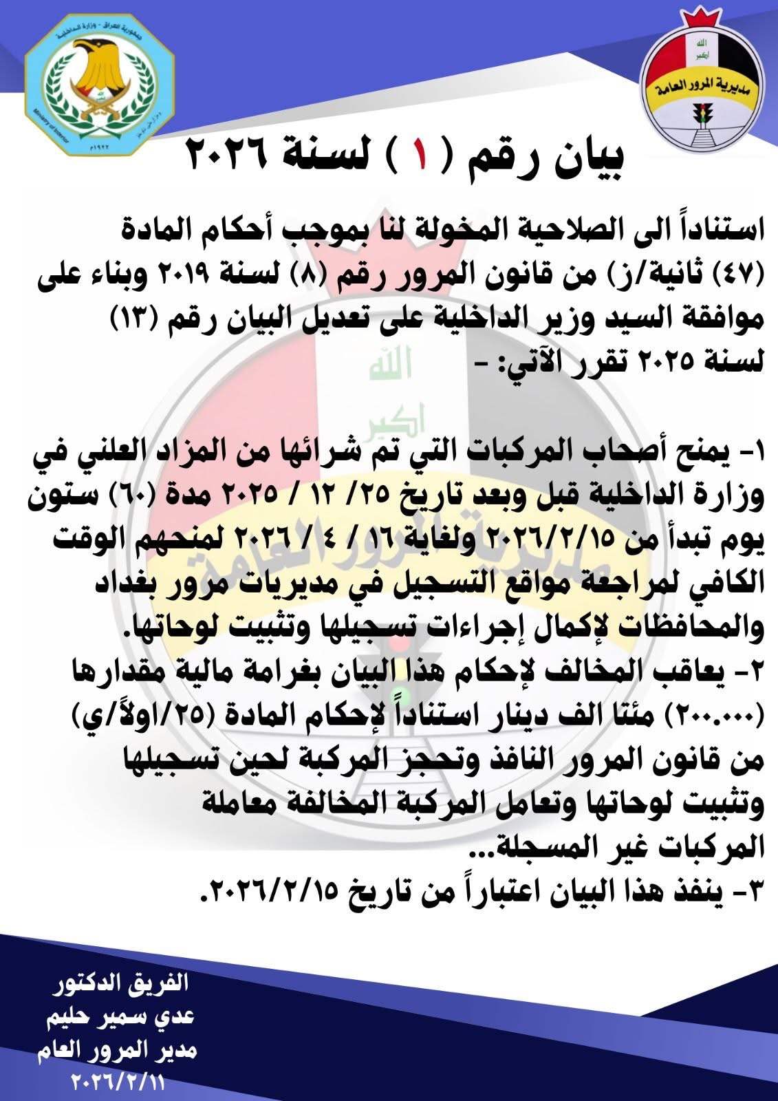 موافقة السيد وزير الداخلية على تعديل البيان رقم (13) لسنة 2025 تقرر الآتي: -